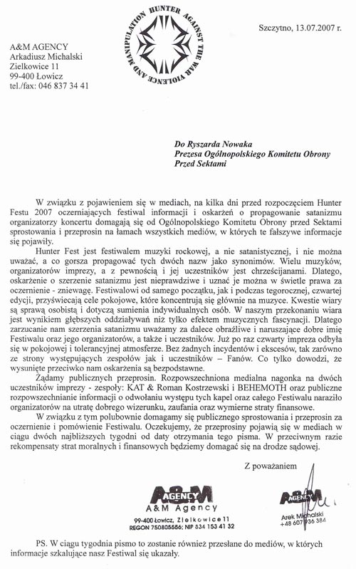 W związku z pojawieniem się w mediach, na kilka dni przed rozpoczęciem Hunter Festu 2007, oczerniających festiwal informacji i oskarżeń o propagowanie satanizmu my, jako organizatorzy, a przede wszystkim Hunter jako gospodarz koncertu postanowiliśmy domagać się od Pana Ryszarda Nowaka, który jest przewodniczącym Ogólnopolskiego Komitetu Obrony przed Sektami sprostowania i przeprosin na łamach wszystkich mediów, w których takowe fałszywe informacje się pojawiły.