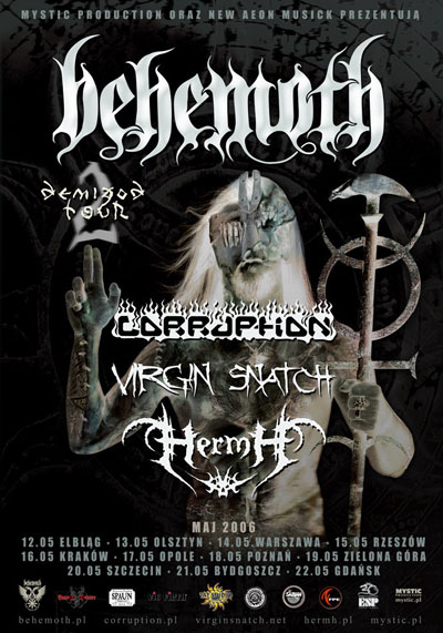 Na tych koncertach Behemoth będzie wspierany przez Corruption, Virgin Snatch oraz Hermh. Zestaw ten zagra w następujących miastach: